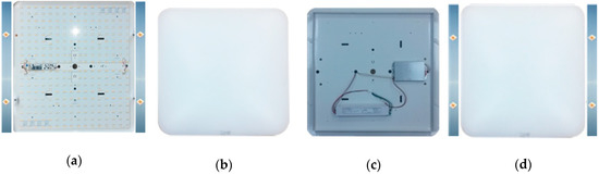 Figure 4b is a diffusion plate for a visible LED having a transmittance performance of approximately 66%, and Figure 4c is a controller and a power supply module for controlling brightness. An AC/DC converter with a 47 V output performance was applied to the power supply module, and the controller was implemented to have up to DC 27 V of output through the LED channel. In addition, Figure 4d shows the front profile of the system after implementing a diffuser plate. Since UVB cannot penetrate the diffuser plate, it was made to cover only visible LEDs.