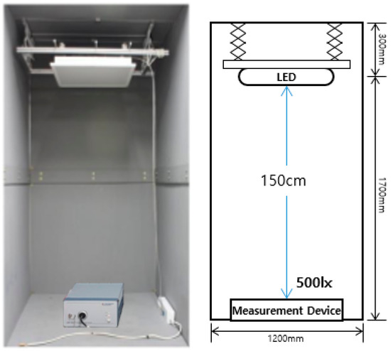 In the lower part, a spectral radiometer was installed, and the distance between the light and the spectral radiometer was kept at 150 cm. The brightness of the light was adjusted to 500 lux. The spectral radiometer used was a CAS 140CT device capable of measuring wavelengths in the range of 200–800 nm. Figure 5 shows an environment for measuring the optical characteristics of the proposed lighting.