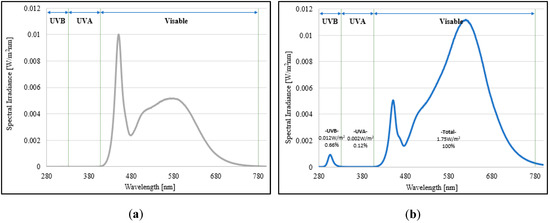 Spectral distribution of commercial and proposed general lighting. (a) General (normal) lighting; (b) proposed lighting (UV and visible).