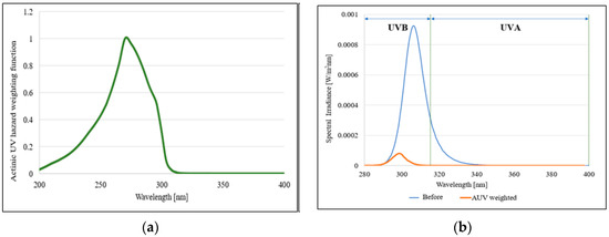 Spectral distribution of the proposed lighting (UV) and actinic hazard weighting function. (a) Weighting function of an actinic hazard; (b) Before and after applying the proposed lighting and the actinic hazard weighting function.
