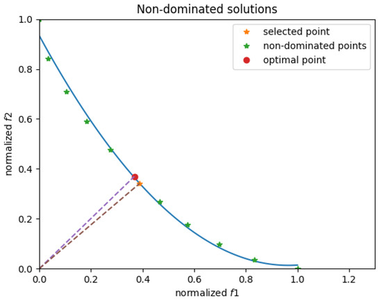 The “criterion” here is to minimize the Euclidean distance between non-dominated solution and the Utopian point. The Utopian point is the infeasible solution with each entry corresponds to the objective of a single-objective optimization problem [33]. For example, the objective of single-objective optimization is the , while the objective of is the . The Utopian point could be (,).