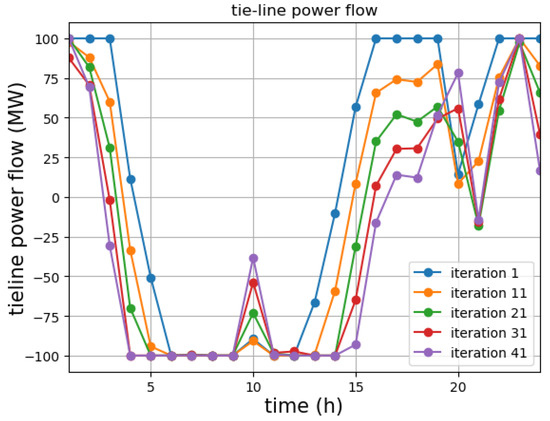 - If is met at all time intervals and (there exists a tie-line between subsystem i and j), or the change MOUC cost is almost invariant, the iteration process is terminated.