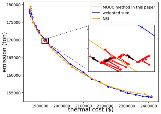 For the above literature about UC, most of the research failed to consider the emission or other environmental indicators, but considered the thermal cost only. However, researchers have addressed that issue by search of the entire Pareto-optimal front, such as weighted sum [16], -constraint [17] and simultaneously optimization [18,19,20], which are time-consuming. In [21], the lexicographic optimization along with augmented -constraint technique are proposed to generate the Pareto optimal solutions, then a Fuzzy-based decision making procedure is implemented to select the most desired solution. Li [22] combines the non-dominated sorting genetic algorithm-II (NSGA-II) and a local search algorithm to look for the Pareto-optimal solutions. Kockar [23] analyses how emission caps and emission market prices can influence generation decisions and the resulting generation scheduling. In [12], the objectives of MOUC are decomposed into several scalar optimization subproblems and optimizing the subproblems simultaneously by using the information from its several neighboring subproblems only.