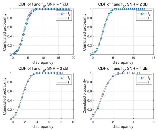 The relationship between f and merits further analysis. If the OSD decoding produces the correct codeword, then ; otherwise . Thus, normally the cumulative distribution function (CDF) curve of f will be located slightly to the left of the CDF curve of . When the SNR increases, the two distribution curves will gradually move closer to each other. According to the central limit theorem (CLT), the distribution converges to a normal distribution with the same mean and variance. In most scenarios, a codeword length of 30 () is sufficient for using the CLT approximation []. Thus, it is reasonable to use a normal distribution to approximate since the codewords in question have a minimum length of 64. This phenomenon can also be verified by simulation. Figure 1 shows the comparison between the empirical CDF curve of f using the OSD-2 method and the Gaussian approximation of for various SNR values. The figure shows that the Gaussian approximations are close to and located slightly to the right of the empirical CDF curve. This observation is also consistent with our analysis.