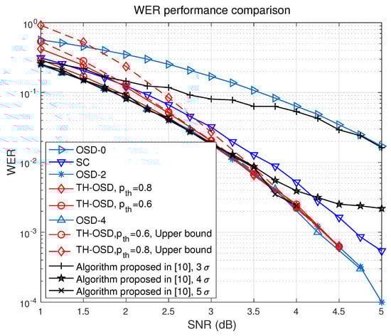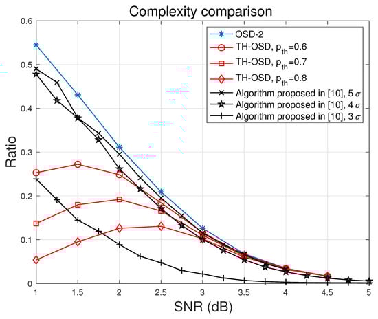 As the figures show, the OSD algorithm performed the best among all the algorithms with TH-OSD’s WER performance below that of OSD. However, as the threshold decreased, TH-OSD’s WER performance approached OSD’s. The performance of OSD-4 was the same as OSD-2’s. These observations are in line with our expectations and confirm that OSD-2 performs similarly to MLD in short-code length scenarios. TH-OSD tested fewer candidate codewords compared to OSD. With a high threshold, TH-OSD performed similarly to SC with low SNR values and outperformed it with mid-to-high SNR values. As the threshold is decreased, TH-OSD’s performance improved at the price of testing more codewords. The performance of the proposed algorithm in [] with threshold is rather poor, and the performance with threshold is close to OSD-2’s performance at the price of barely no complexity reduction compared to the original OSD which can be seen in the next subsection. The SC is a suboptimal decoding method since it discards the information provided by further frozen bits when decoding an information bit []. As a result, SC’s WER performance was not good. SCL with a large list size also achieved performance similar to MLD’s, but we excluded its curve from Figure 3 to preserve clarity.