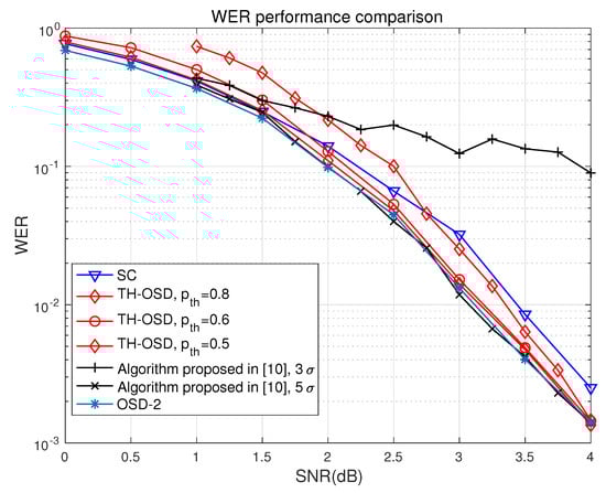 WER performance comparison between SC, OSD, the algorithm proposed in [] and TH-OSD with codeword length 128 and rate 0.5.