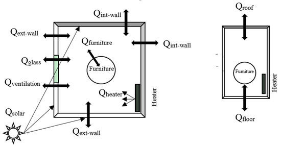 where Qi is the rate of heat transfer for the exterior and internal walls, roof, floor, ventilation, windows, and furniture. Additionally, Qgen is the rate of thermal generation due to the building’s indoor equipment.