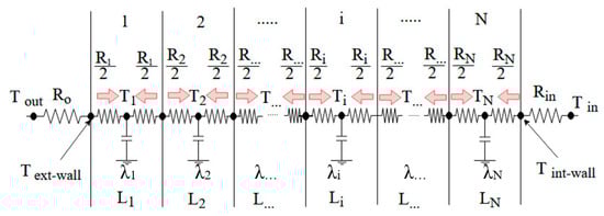 Figure 2 shows the layout of an external wall with the thermal resistance model [11]. External walls are notable nodes in the building envelope because these are consequently affected by solar and internal irradiation. The effect of solar radiation is accounted by means of the increase of temperature which it induces on the external surface of the wall.