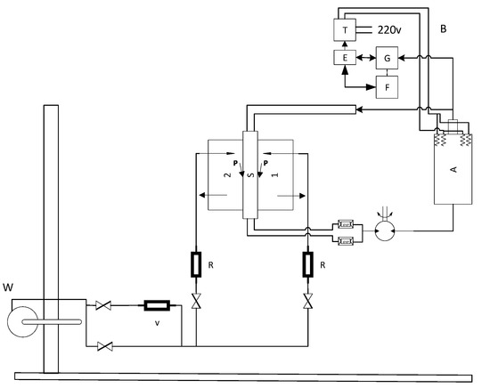 Schematic of apparatus (modified from [39]). A: boiler; B: regulation system; E: regulator; F: thermostat; G: regulation system; P: wall; R: rotameter; S: source; T: transformer; V: Venturi meter; W: fan.