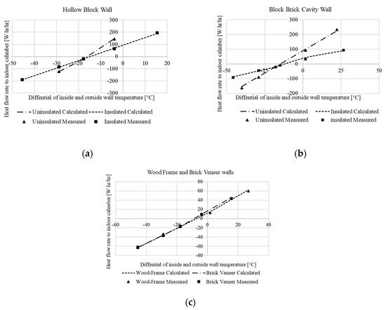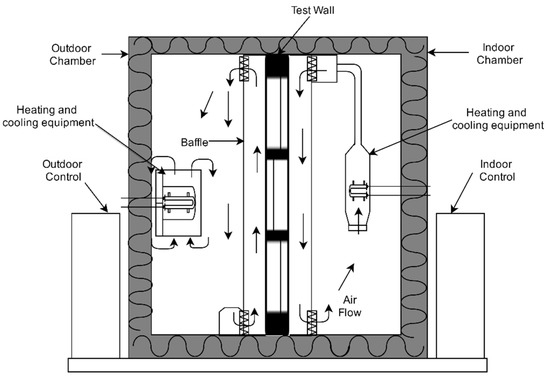 The second validation was based on the experiments by Fiorato and Cruz [40], in both steady-state and dynamic conditions, of six masonry walls, in order to investigate their heat transfer characteristics. The apparatus consisted of a calibrated hot box facility made up of two highly insulated chambers. This system was designed to accommodate walls with thermal resistances varying from 0.26 to 3.52 [K/(m2W)]. The outdoor chamber was maintained at a constant temperature or oscillating between −29 and 49 °C, and the indoor chamber was maintained between 18 and 27 °C [40]. The schematic of apparatus and wall characteristics is shown in Figure 4 and Table 2, respectively.