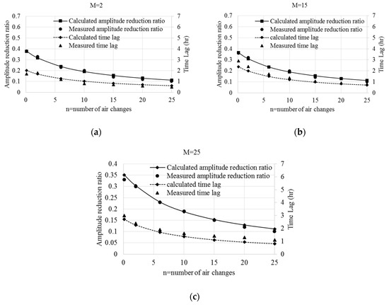 The amplitude reduction ratio and time lag different heat capacity: (a) M = 2; (b) M = 15; and (c) M = 25.