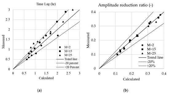 Comparison between calculated and measured data: (a) Time lag; and (b) amplitude reduction.
