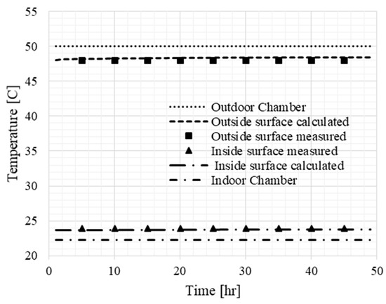 During tests in steady-state conditions, the chambers were maintained at a constant temperature and the wall was exposed to a steady differential temperature. The temperatures were kept constant for a proper time until the steady-state condition occurred. In the Simulink model, the indoor chamber air temperature was controlled at 22 °C; the outdoor air was kept at a constant value to obtain a difference of temperatures equal to −45.6, −28.9, −17.8, 1.7, and 26.7 °C.