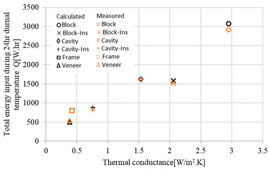 Figure 7 shows the comparison between the experimental values and the calculated ones, for a steady-state temperature difference and the wall configuration number 4 (block brick cavity).