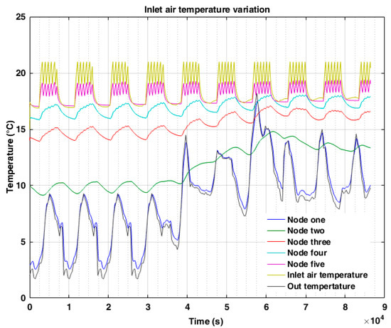 The state-space equations were solved by using the state-space functionalities integrated in the Simulink library. Outdoor temperatures, and east and south solar radiation for the first week of January were inputs for the state-space model. The variation of temperature for each layer, the inlet air temperature, and the energy consumption were the outputs of the state-space simulation.