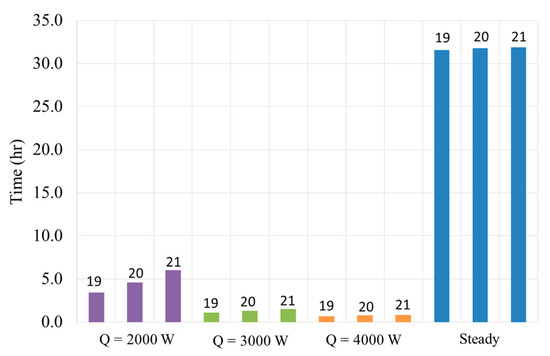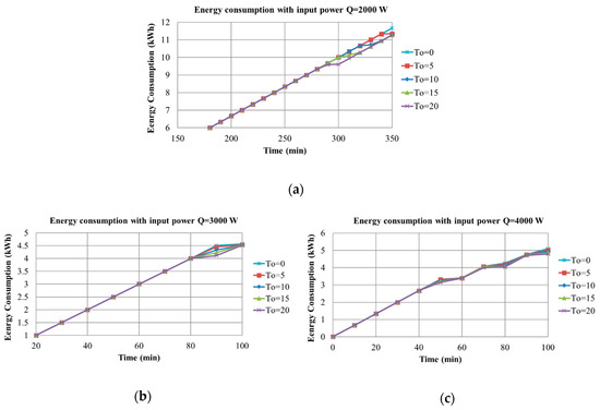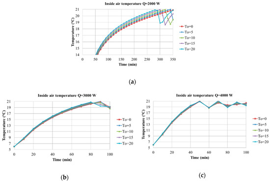 Figure 24 displays the variation of temperature, for different heater power levels, with different outdoor temperatures. As the total power, required from this building at steady-state, was only 1300 W, it can be clearly seen, in Figure 24, that a heater power of 2000 W would need the help of a building management system and remote control to reach a comfortable condition in time. On the other hand, looking at the green line with 4000 W, it is possible to notice that it did not cause any relevant reduction of the delay with respect to the case whereby only heaters with 3000 W were installed.