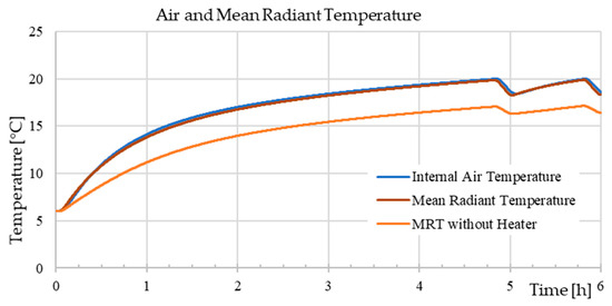 It is possible to see that the transient of the MRT was substantially like the one of the inlet air. Nevertheless, if we look at the MRT, calculated on the not-heated surfaces only, it is possible to see that the temperature was lower than the internal one and that MRT took about twice as long to reach comfortable values. For this reason, it is important to evaluate this parameter in building simulations.