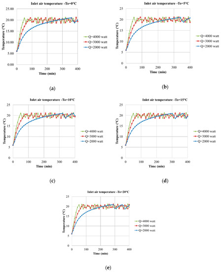Variation of temperature with different input powers and different outdoor temperatures: (a) To = 0 °C; (b) To = 5 °C; (c) To = 10 °C; (d) To = 15 °C; and (e) To = 20 °C.