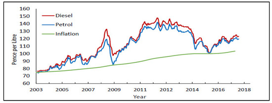 - Department for Business, Energy & Industrial Strategy. Statistical Data Set-Weekly Road Fuel. 2018. Available online: https://www.gov.uk/government/statistical-data-sets/oil-and-petroleum-products-weekly-statistics (accessed on 16 April 2018).