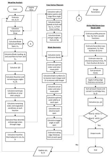 Based on systems of equations from literature, a MATLAB algorithm was developed that can perform the preliminary design process of a single stage axial turbine based on a given set of boundary conditions and design parameters. As the thermodynamic calculations involved in velocity triangle derivation are based on assumed values of blade row loss components and stage efficiency, it was necessary to iterate the solution to converge to a realistic design. The operational process of the algorithm is presented in Figure 2. Initial attempts to iterate the loss components were based on the two-dimensional meanline losses from purely thermodynamic equations. These proved to be highly unstable and would diverge with most combinations of input parameters. The solution was to allow the system to finish a full design procedure for each iteration up to and including the geometry calculations. This way, instead of the meanline losses, the efficiency and loss components would be fed back from the Ainley-Mathieson performance calculations. It was a concern that this would significantly increase the computational time required to generate the design space meta-data as each iteration would contain a full run of the system as opposed to just the meanline analysis, however this method proved to be very stable, and was always able to converge within 10 iterations. This meant that it was more accurate, more stable and more computationally efficient.