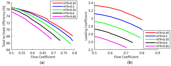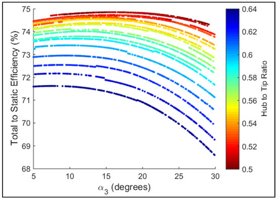 Figure 6 depicts the effect of the design parameter (absolute gas angle at rotor exit) on the turbine total to static efficiency by plotting individual design points as points coloured by their hub to tip ratio. Higher HTR turbines offer higher efficiency, however with diminishing returns as the lower end of the HTR design range is approached. This effect is due to the definition of tip clearance. As is a percentage of the blade height, the magnitude of the tip gap is larger for longer blades, which penalises the lower hub to tip ratio designs. There are also clear lines of constant hub to tip ratio that emerge due to the area difference filtering. The design space sweep automatically discards any solutions where the value of area difference defined in Equation (3) is greater than 1% to ensure the thermodynamic requirements are supported by the stage geometry. These results show that each HTR value will have only have a small number of flow coefficients that it can pair with to produce an area difference <1%.