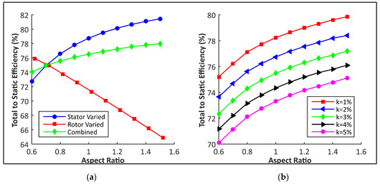 One of the most important design parameters in the creation of the turbine three-dimensional profile is the aspect ratio, because it is used to determine the blade chord length (Equations (A42) and (A43)). In experimental conditions or CFD analysis increasing the chord length would have a significant effect on the frictional losses from boundary layer viscosity over the blade surface [10]. Using the Ricardo WAVE boundary conditions and providing a set of design parameters while varying the aspect ratios allows the theoretical effect of the blade chord length to be plotted. Figure 7a shows the effect of varying the aspect ratios independently for each blade row as well as in unison. Reducing the chord length of the stator non-linearly increases the total to static efficiency, which suggests that as long the flow is guided and accelerated sufficiently by the stator, additional chord length merely increases frictional losses without providing any benefit. Figure 7a also shows that increasing the aspect ratio of the rotor has a linearly negative impact on the stage efficiency. This suggests that the turbine blades efficiency at expanding the flow is related not just to the flow turning angle and deceleration, but also the distance over which this expansion occurs. The effect of varying the aspect ratios together is dominated by the stator, with a small increase in efficiency for a reduction in chord length on both blade rows.