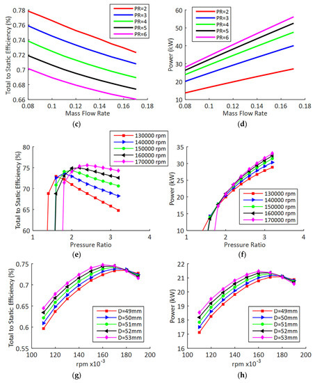 The results of maintaining a design pressure ratio of 2.04, determined by the Ricardo model, while varying the maximum diameter of the turbine can be seen in Figure 8g,h. Higher diameter turbines provide higher efficiency and since this occurs at the same pressure ratio the power is also increased. The shaft speed at which the highest efficiency condition occurs reduces as the size of the turbine increases. This results in smaller turbines providing higher design point efficiencies at very high shaft speeds. For these engine conditions this occurs around 180,000 rpm.
