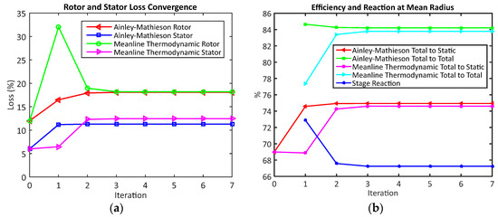 The design space was sorted based on efficiency and designs with geometric properties not conducive to ‘good’ blades were filtered out. These included high rotor inlet angles at the hub and unrealistically high stagger angles at the tip. The convergence graphs for the chosen preliminary design point can be seen in Figure 9a,b. The solution converged after 7 iterations and resulted in loss coefficients of and This produces a turbine stage with predicted efficiencies of = 74.94 and = 84.20%. The estimated stage reaction at mean span is R = 67.24%. The meanline losses are accurate for the rotor but show a slight overestimate for stator, resulting in slightly lower thermodynamic efficiencies than the Ainley-Mathieson predictions.