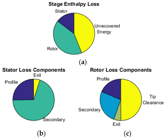 Breakdown of enthalpy losses across (a) turbine stage (b) stator (c) rotor.