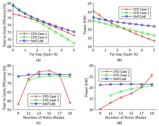 MATLAB algorithm validation for (a,b) tip gap prediction (c,d) blade number prediction.