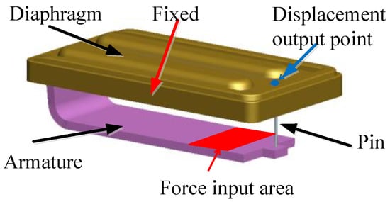The modeling of the mechanical simulation is demonstrated in Figure 3. The structure contains the armature, pin, and diaphragm. Magnetic force is generated on the armature end. The diaphragm vibrates through the pin connection. The edge of the diaphragm is fixed.
