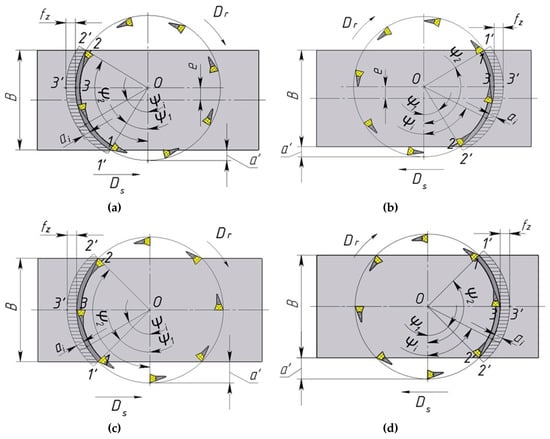 Below in Figure 2a–d, the diagrams are depicted which represent the positions of the cutter and workpiece, described by the a′ factor during the flat face milling, with the milling width B lower than the cutter’s diameter D. The a′ parameter is defined as a translation of cutter’s rotational axis in the direction perpendicular to the feed motion towards the workpiece’s axis of symmetry, parallel to the feed motion. Asymmetric face milling (with positions symmetry of cutter and workpiece in direction that is transverse to feed е, e; positions the end of the cutter diameter and the beginning of the workpiece, ) is depicted in Figure 2a,b, whereas the symmetric face milling is presented in Figure 2c,d.