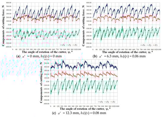 Figure 3a–c show also that independently on selected radial immersion, the feed Fy, and feed normal force Fx components’ absolute values are significantly higher than thrust force Fy values. It should be noted that Fy and Fx components are directly correlated with milling kinematics and the chip decohesion process. On the other hand, the thrust force is only marginally dependent on chip formation mechanisms, and its value is strictly correlated with the rubbing and ploughing mechanisms occurring between the tool’s flank face and the machined surface. Thus, the potential growth of thrust force could be attributed to the relatively high friction coefficient between the workpiece and the tool flank face, as well as to the progressing tool wear.
