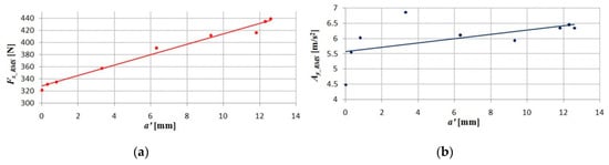 In case of surface roughness parameters (Figure 5a,b), the increasing trend with the growth of is found. However, local oscillations of these values, mainly in the range of 0 ≤ ≤ 6.3 mm, can be observed. The highest values of Ra and Rz parameters occur for the = 12.6 mm, which also corresponds to the highest measured values of Fx force and Ay accelerations of vibrations. Therefore, the correlation between the formation of surface roughness and process dynamics can be exposed. Nevertheless, during the face milling process, the formation of the surface profile can be also strongly affected by geometrical errors in the machine-toolholder-tool system, plastic and elastic deformations of the material being cut, homogeneity of the workpiece, as well as some random factors.