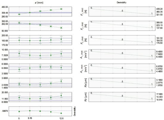 Figure 6 depicts the values of partial and total desirability. The total desirability chart characterizes the relations between the and simultaneous effect of all investigated quantities. It can be concluded from this chart that the optimal relative position of the tool and the workpiece is equal to _opt = 3.15 mm. The face milling process with the selection of _opt enables the obtainment of total desirability at the level of 0.57. This means that simultaneous achievement of the lowest response values is not possible with the application of _opt. However, during face milling with _opt = 3.15 mm, the cutting force components’ RMS values will not exceed 360 N for the Fx, 265 N for the Fy, and 185 N for the Fz. The acceleration of vibration RMS values will not exceed 7.3 m/s2 for the Ax and 6 m/s2 for the Ay. Moreover, the surface roughness parameters will be at most 2 µm for the Ra and 12 µm for the Rz.