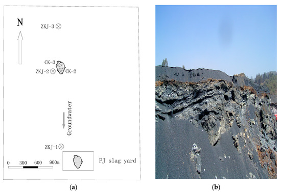 Water quality near the slag field was collected and analyzed to evaluate the slag yard effects on surrounding groundwater. The groundwater sampling sites were ZKJ-1, ZKJ-2, and ZKJ-3, shown in Figure 1. Table 1 also lists the groundwater sampling sites. The water samples were obtained from the wells.