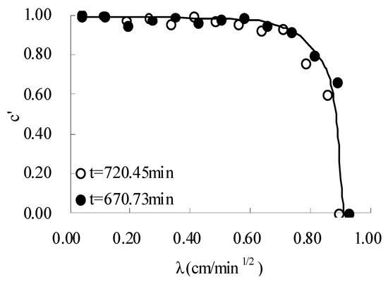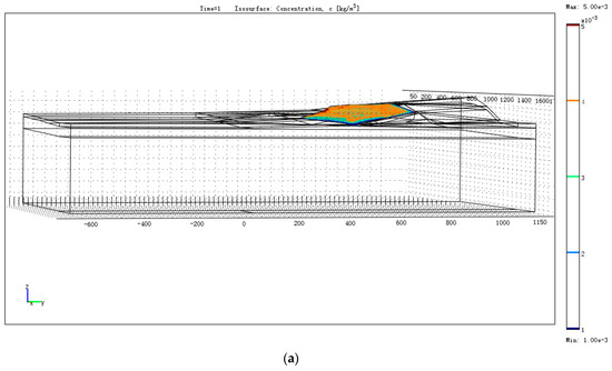 The parameters of the materials used in the dispersion calculation are shown in Table 7. The molecular diffusion coefficient of material 2 was determined as Dm = 4.85 × 10−6 m2 s−1 based on the unsaturated dispersion test results shown in Table 5 and the clay saturation of survey results shown in Table 8. Other parameters, shown in Table 7, were determined according to the experience values in geotechnical engineering.