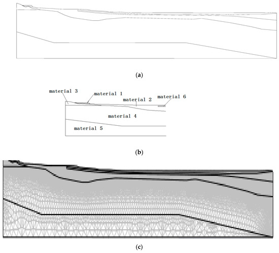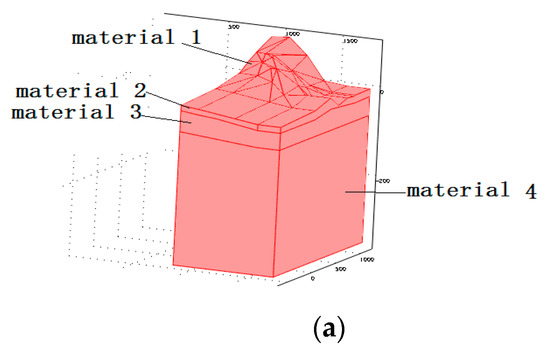 Two simulation models based on exploratory boring are shown in Figure 5 and Figure 6 [22]. The 2D simulation model in Figure 5 was 10.462 km in length and 1.058 km in height and jointed by a lake. The 3D simulation model in Figure 6 was modelled by 8 profiles and was 1.840 km in length along the y direction, 0.89 km in width along the x direction, and 0.439 km in height. The layout of the ground layers was shown in Figure 5a,b and Figure 6a. Materials 1–4 of the 2D-model and the 3D-model were the same, but the 3D-model did not include material 5 because the 3D-model was shallower than the 2D-model.The 2D model was divided into 42,236 elements with 21,648 nodes, while the 3D model was divided into 67,968 elements with 14,620 nodes.
