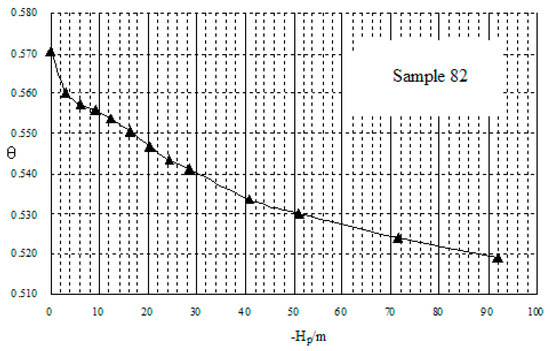 Soil–water characteristic curves for material 1 and material 2 were obtained from a volumetric pressure plate test, and the pore volume fractions were estimated from the corresponding soil–water characteristic curves. The residual water volume fractions for material 1 and material 2 were obtained from the drying method. The saturated permeability coefficients for material 1 and material 4 were estimated from a water injection test. Other parameters were determined according to the experience values in geotechnical engineering. All the saturated permeability coefficients of the materials, except those of material 2, are shown in Table 6 for simulation. The permeability coefficients of material 2 were important for determining the seepage field. Therefore, they were determined by inverse analysis based on the test results. Materials 1 and 2, whose soil–water characteristic curves were obtained from the test results, were set to be unsaturated materials. The soil–water characteristic curves of material 2 are shown in Figure 7, and the experimental curve of sample 82 was used for simulation. The test results indicated that the saturated permeability coefficient of material 2 in the vertical direction ranged from 5 × 10−9 m/s to 1 × 10−7 m/s. Simulation analysis showed that the simulation results of the seepage field could fit the actual seepage field better if the saturated permeability coefficient in the vertical direction was 8 × 10−8 m/s and that in the horizontal direction was 3 × 10−8 m/s.