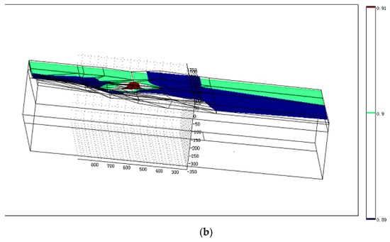 Survey results showed that clay had a high saturation of approximately 0.95, as shown in Table 8. The simulation results of the 2D model showed that the saturation of clay near the slag in Figure 8 ranged from 0.89 to 0.95. The simulation results of the 3D model showed that the saturation of clay near the slag in Figure 8 ranged from 0.89 to 0.91. The saturation of clay near the slag in Figure 8 was approximately 0.9. The simulation results were consistent with survey results. The results of the calculations showed that the relative error between the simulation results and the survey results was less than approximately 10%. According to the Technical Requirements for Groundwater Numerical Simulation [23], a relative error below 10% is acceptable. Therefore, the formation model established for this study was feasible for the simulation.