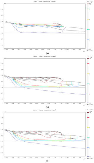 Simulated concentration contour of fluorine in groundwater of the situation of the neighboring slag yard of 2D model: (a) 1 year after disposal started, (b) 52 years after disposal started, and (c) 100 years after disposal started.
