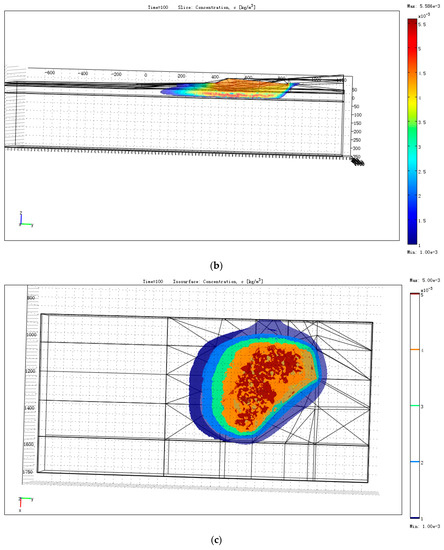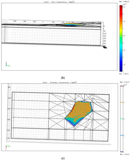 Simulated concentration contour of fluorine in groundwater of 3D model 1 year after disposal started: (a) the overall situation, (b) the situation of a typical profile, and (c) the situation of plan view.