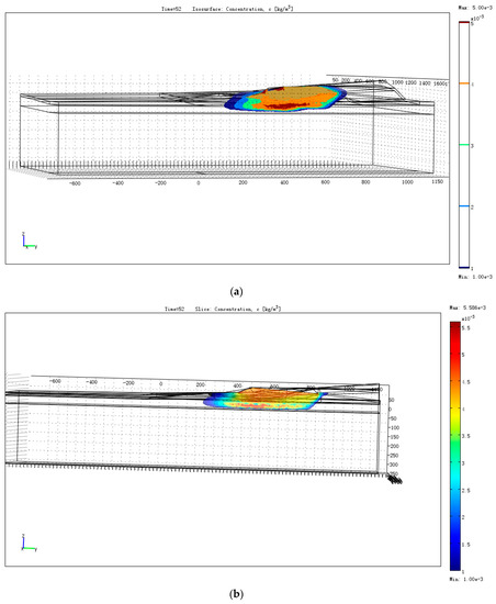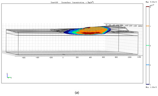 Figure 10, Figure 11 and Figure 12 provide some solute migration simulation results of the 3D model. Over time, the solution with the fluorine concentration in the slag field migrated outward slowly. The dispersion velocity near groundwater was so large that the fluorine concentration in the groundwater did not increase with time. The final fluorine concentration in the groundwater 100 years after disposal started did not exceed 0.001 kg m−3. The concentration in the groundwater did not exceed the legislative upper limit of the second-grade water of China. The maximal pollution water range, from the slag yard to the south, 52 years after disposal started, was approximately 185 m, and the range 100 years after disposal started was approximately 330 m. The maximal pollution water range, from the slag yard to the west, 52 years after disposal started, was approximately 75 m, and the range 100 years after disposal started was approximately 135 m. The maximal pollution water range, from the slag yard to the east, 52 years after disposal started, was approximately 60 m and the range 100 years after disposal started was approximately 80 m.