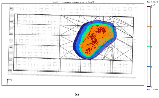 Simulated concentration contour of fluorine in groundwater of 3D model 52 years after disposal started: (a) the overall situation, (b) the situation of a typical profile, and (c) the situation of plan view.
