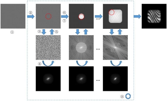 - Replace the magnitude of the Fourier spectrum obtained at step ③ with the measured data and keep the phase unchanged:where is calculated from Equation (4) from the collected speckle patterns.