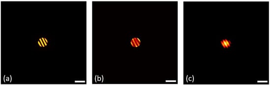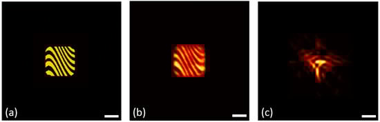 The main experimental results are illustrated in Figure 3. In Figure 3a, we plotted the ground truth target image, which was loaded on the DMD. The reconstructed image is shown in Figure 3b. It is clearly seen that the target can be reconstructed using the proposed approach. In principle, the resolution in this case is limited by several factors. For example, the size of the illumination spot on the scattering medium determines the size of the speckle grand, which should be large enough to be resolvable by the camera. When this is met, the resolution is mainly determined by the effective diameter, , of the variable iris placed between the scattering medium and the camera, which is given by [19]. In our setup, mm, giving a theoretical resolution μm. More effects of the variable iris on the image performance can be found in References [3,12].