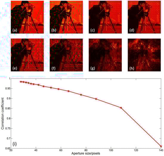 Effect of the diameter of the probe beam to the reconstruction performance. (a) The target, (b) 28 pixels, (c) 32 pixels, (d) 36 pixels, (e) 46 pixels, (f) 76 pixels, (g) 108 pixels, and (h) 140 pixels. (i) The correlation coefficient against a different aperture size.