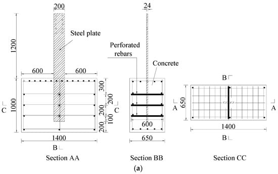 Three kinds of pull-out test specimens were proposed to investigate the mechanical performance of PBL connectors with different embedded depths. The embedded depth indicated the distance between the nearest perforated rebar and the concrete surface in the pull-out direction. For the first type of specimen (PA1, PA2, and PA3), the embedded depth was 300 mm, as shown in Figure 1a, while an embedded depth of 150 mm was employed in the second type (PB1, PB2, PB3), as shown in Figure 1b. The third type of specimen (PC1, PC2, PC3) was similar to the first type but without perforated rebars. Specimen PC3 was not considered due to a manufacturing error. The three-dimensional view of a pull-out specimen is shown in Figure 1c. The PA and PC specimens consisted of the concrete member (1000 × 650 × 1000 mm), steel plate (2000 or 1850 × 200 × 24 mm), perforated rebars (22 mm in diameter), and reinforcing bars (16 mm in diameter). Preformed holes 65 mm in diameter were drilled through the steel plate, except in PC specimens. In addition, no perforated rebar was installed in PC specimens. The material strength tests were carried out according to TB 10002.3-2005 []. The mechanical properties of the concrete C50 were obtained from standard cube samples (150 × 150 × 150 mm). The average compressive strength and Young’s modulus of the standard cubes after 28 days of curing were 59.2 MPa and 34.5 GPa, respectively. In addition, tensile tests were performed for the structural steel and reinforcing bars. The mechanical properties of the materials are listed in Table 1. C50 concrete was adopted in the concrete member. Q345qE low-alloy high-strength bridge structural steel was used for all steel plates. The perforated rebars and reinforcing bars were made of HRB335 steel.