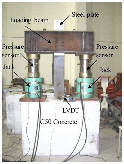 The setup of the pull-out test is illustrated in Figure 2. Two 2500 kN jacks were used to apply a vertical force to the steel plate. To control the loading process accurately, two pressure sensors were installed there. The slip distribution in multiple holes of a PBL shear connector was inconsistent throughout the depth. However, the experimental data from a relevant study also showed slight differences throughout depth []. Hence, it is acceptable to ignore the slight differences. The slip here was represented by the displacement of the whole steel plate. The relative slips between the steel plate and concrete were measured by two linear variable displacement transducers (LVDTs).