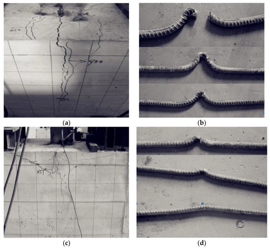 To investigate the connection behavior of PBL shear connectors, many experimental studies have previously been conducted by Xiao et al. [], Liu et al. [], Wang et al. [], Zhang et al. [], and Zhao et al. []. In this study, experimental tests were performed to measure the connection performance of PBL shear connectors with different embedded depths. The failure mode of the PA specimens is shown in Figure 3a,b. Initial cracks appeared in the PA1, PA2, and PA3 specimens when the load increased to 750 kN, 850 kN, and 850 kN, respectively. As the load level continued to increase, some cracks occurred at the concrete surface corresponding to the first row of the PBL connector, and the angle was 60 degrees from the horizontal axis. Furthermore, the sound of the perforated rebar breaking was heard when the load reached 1100 kN. After that, the deformation increased quickly and the steel plate was pulled out; as a result, the specimen could not sustain the load anymore. These results suggest that PA specimens with PBL shear connections had a good bearing capacity.